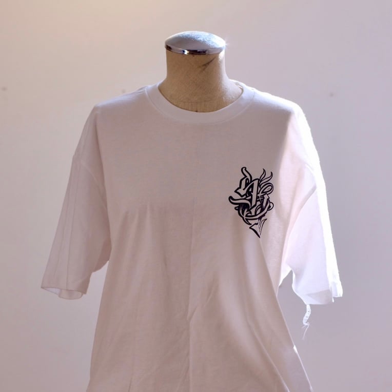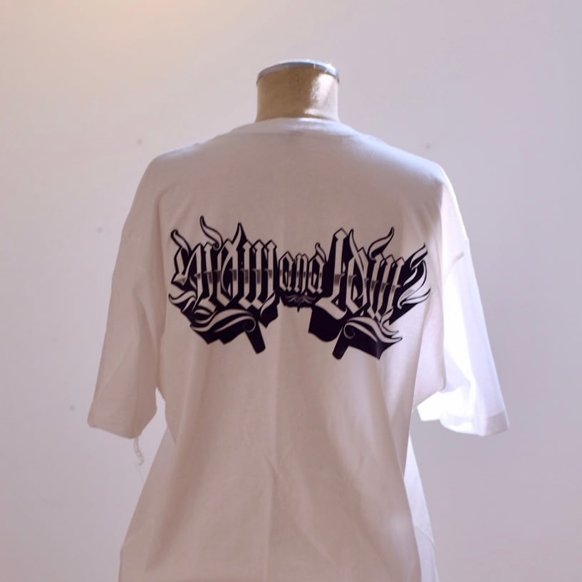 White shirt / black print with stylized Slow & Low logo on front left breast and graphic on back.