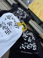 Black shirt / white print with 3.5" classic Slow & Low logo on front left breast and 9.5" x 15" graphic on back.